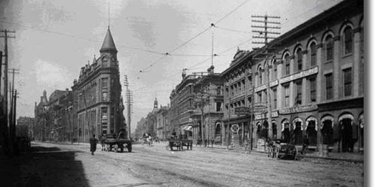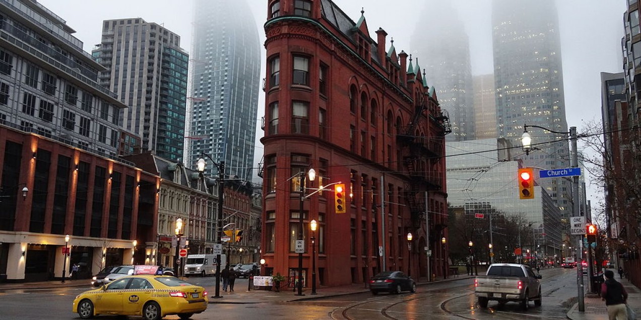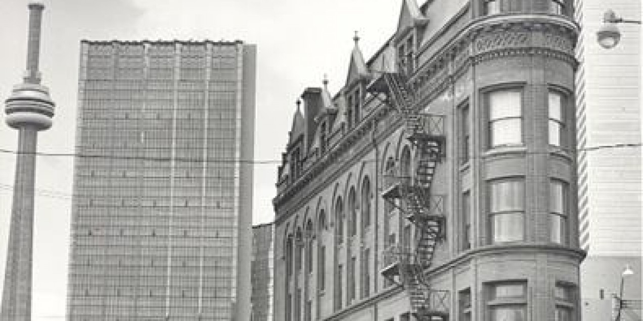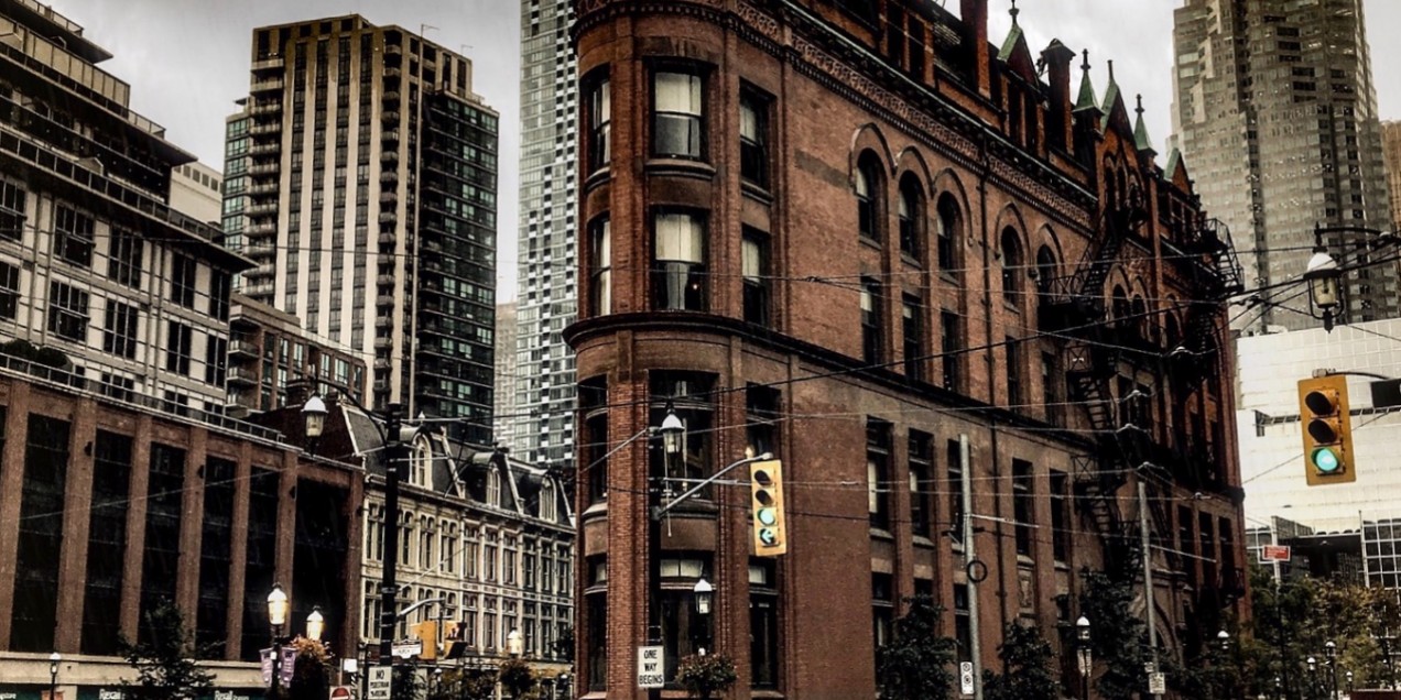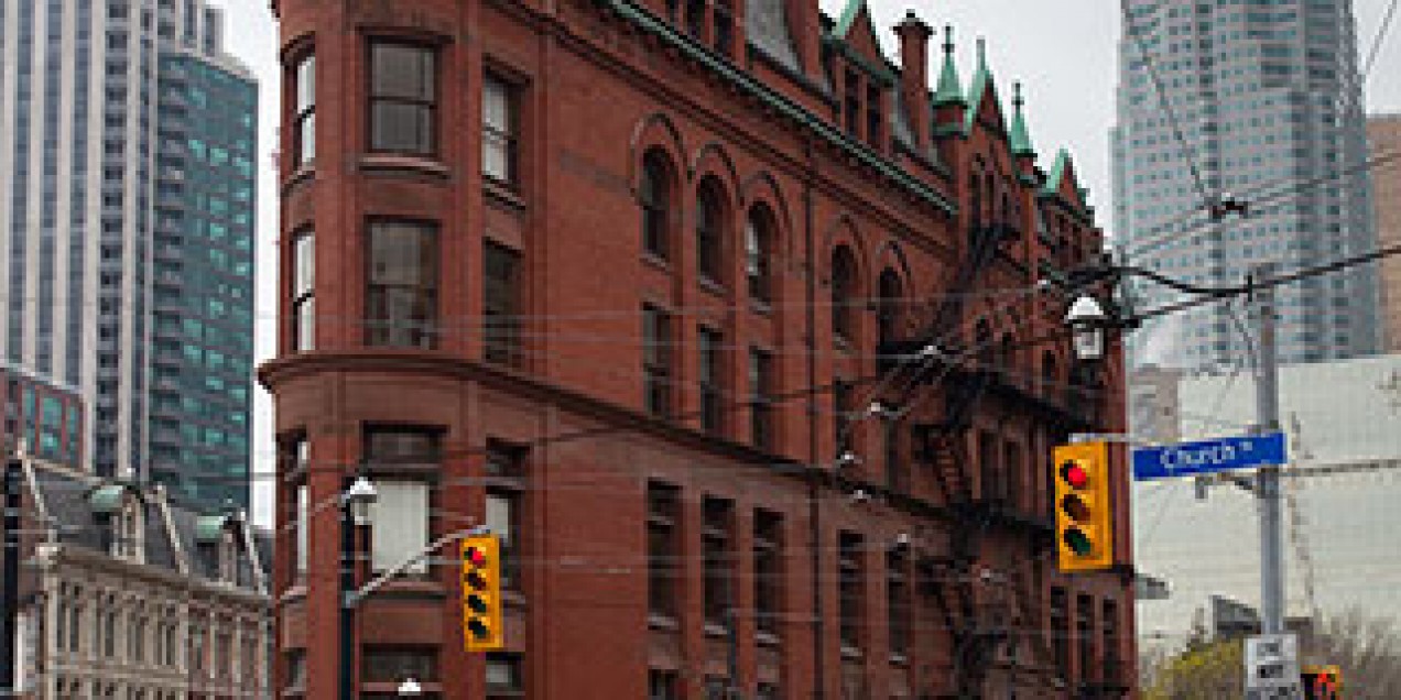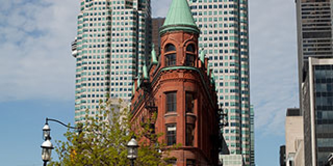 The Gooderham Building stands like a ship’s bow at the intersection of Church, Wellington and Front streets. It was built to house offices belonging to the Gooderham family, who grew wealthy in the distilling and banking industries. Nicknamed the “Flatiron Building” for its resemblance to an old-fashioned clothes-iron, the building's triangular shape results from the meeting of Wellington Street with Front Street and the diagonal route that followed the 19th-century waterfront.