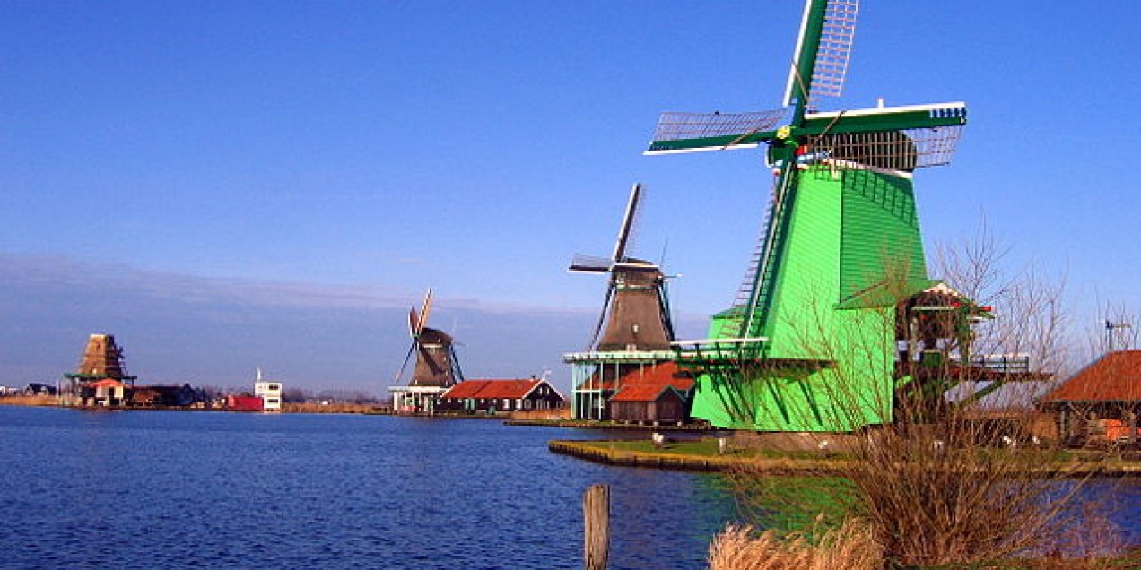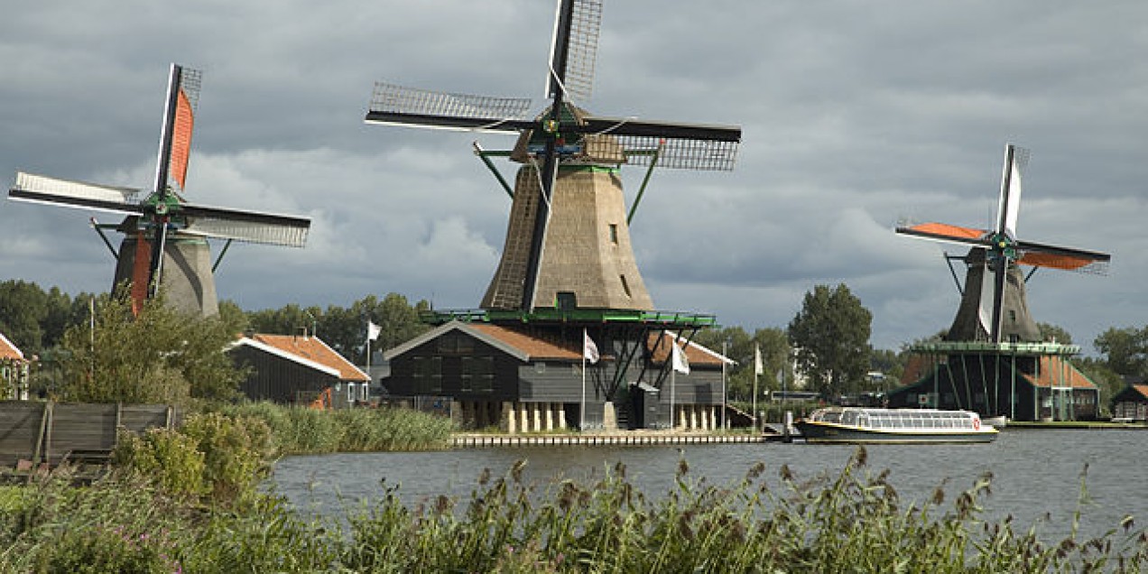 For centuries peat was the sole source of natural riches in Zaanstreek, the watery moorland on the banks of the River Zaan. But right next door Amsterdam was expanding to the status of one of the world’s great cities and demand for goods rose to an immense level. Suddenly Zaanstreek moved into the centre of attention. For this flat landscape had something more precious to offer than peat. Wind! In 1594, just at the right time, a man named Cornelis Corneliszoon von Uitgeest revolutionised the building of windmills by equipping them with a crankshaft. This improved their performance out of all proportion with the result that every windmill became a small factory in itself. More than a thousand windmills sprung up in Zaanstreek during the 17th and 18th centuries. They sawed wood, threshed corn, pressed grain and nuts to oil, milled coloured powder from chalk and ground snuff from tobacco leaves. All sorts of craftsmen moved into the area including tin founders, boat builders, sail makers and last not least a man called Gerrit Kist, who had worked for a time at the court of the Russian Czar in Moscow. He was later to make a name for himself as the man who accommodated the Czar in his cottage in Zaanstreek for a week. The Czar had come there as an for the purposes of industrial espionage, for in those days the area had a reputation of being a centre of innovation. Now it is one of the oldest manufacturing areas in Europe. Of the countless windmills which once dotted the landscape only 12 have survived, five of which are standing in Zaanse Schans. All of them have now been restored to working order and continue to saw and grind just as they did centuries ago.