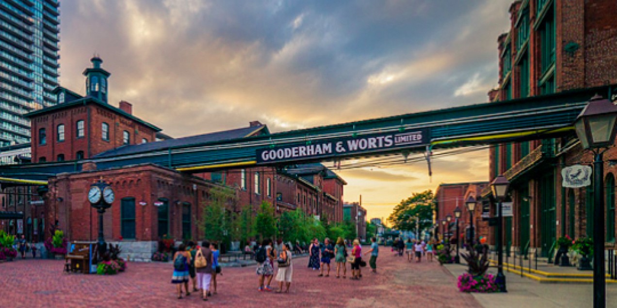 In 1832, brothers-in-law James Worts and William Gooderham built a windmill on the shore of Lake Ontario. After Worts’s death, Gooderham added a distillery and launched a business that would become the largest distillery in the British Empire, and for a time, in the world. That windmill has disappeared, but more than 40 late 19th-century buildings remain. They are a testament to the creative integration of the past with completely different, modern uses.